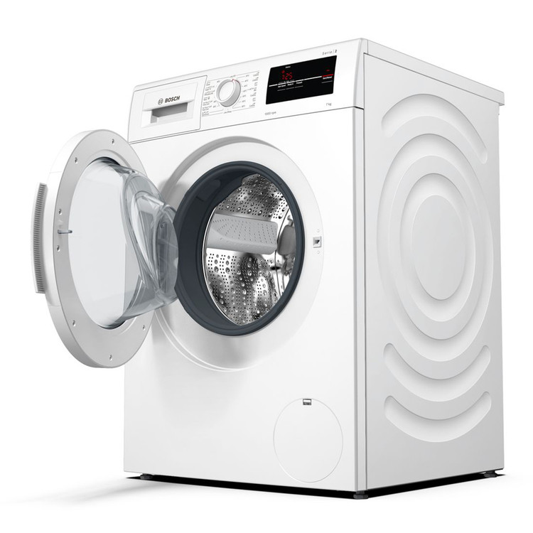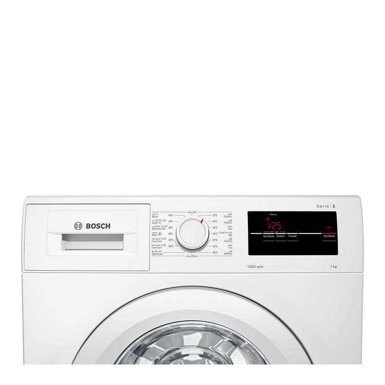 ماشین لباسشویی بوش BOSCH مدل WAJ20170SGC با رده انرژی +++A جزء لباسشویی های کم مصرف و پر طرفدار شرکت بوش میباشد. لباسشویی 20170 دارای ظرفیت 7 کیلوگرم بوده که مناسب برای خانواده هایی با جمعیت متوسط میباشد. طراحی دیگ به صورت موجدار بوده که موجب شستشوی آرام و کارآمد البسه میشود. پنل این لباسشویی دارای نمایشگر دیجیتال ، کلید های تنظیم عملکرد و ولوم چرخشی برای تنظیم برنامه ی شستشو میباشد. برنامه های شستشو شامل شستشوی الیاف نخی با دما های 20 ، 40 ، 60 و 90 درجه ، شستشوی اقتصادی با دمای 40 و 60 درجه ، شستشوی الیاف ظریف ، پشمی ، ملحفه و شستشوی سریع 15 دقیقه ای میباشد. توسط کلید های تنظیم عملکرد نیز میتوان قابلیت VarioPerfect ، speedPerfect و عملکرد شروع با تاخیر را تنظیم نمود. از طریق قابلیت Vario Perfect در این لباسشویی میتوان متناسب با نوع لباس ، برنامه شستشو را انتخاب نمایید که موجب صرفه جویی 65 درصدی در زمان و 50 درصدی در مصرف انرژی میشود. در صورت فراموش نمودن افزودن لباسی برای شستشو یا بیرون آوردن لباس حین شستشو میتوانید از عملکرد توقف استفاده نمایید. در صورت باقیماندن کف روی البسه توسط سنسور تشخیص کف ، شستشو و آبکشی ادامه می یابد. طراحی خاص دیواره دستگاه موجب کاهش صدا و از بین رفتن لرزش حین کار میشود. توسط شروع با تاخیر نیز میتوان شستشوی البسه خود را از 1 تا 24 ساعت تنظیم نمایید. در این صورت حتی در زمان هایی که در منزل نیستید نیز میتوان دستگاه را روشن و البسه را شستشو نمود