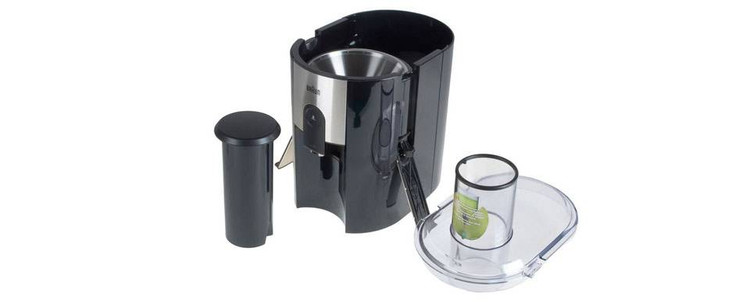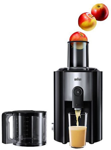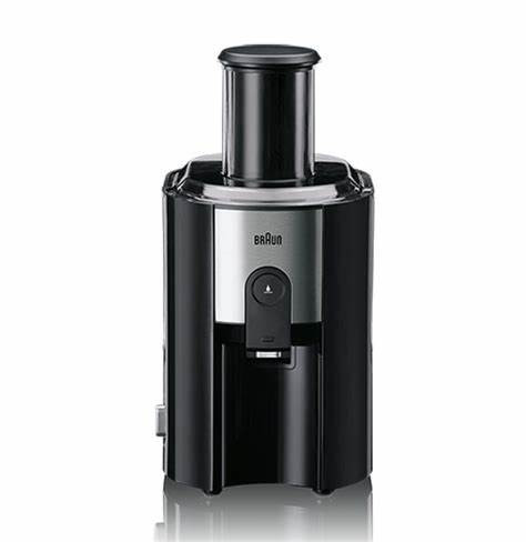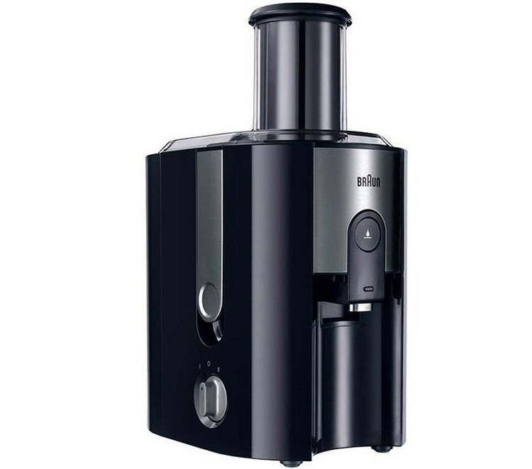 آبمیوهگیری براون مدل «J500» یکی از آبمیوهگیریهای تککاره موجود در بازار است. این دستگاه از بدنهای از جنس پلاستیک بادوام و استیل ساخته شده و استحکام خوبی دربرابر ضربه دارد. قسمت ورودی میوهها در بخش بالایی دستگاه واقع شده است که با قطر زیادی که دارد، میتواند بهآسانی قطعات بزرگ میوه را از خود عبور دهد. این ویژگی کار با دستگاه را آسانتر کرده و به آن سرعت بخشیده است. در طراحی این محصول استوانهای در نظر گرفته شده که پس از قرار دادن میوه بر دهانه ورودی دستگاه میتوان با استفاده از آن میوه را به سمت تیغهها هل داد.