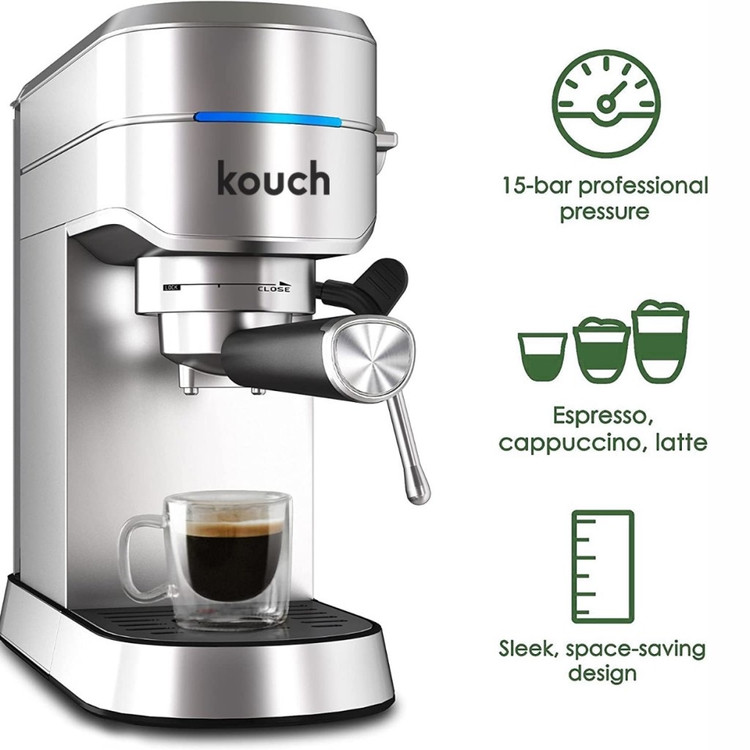 دستگاه اسپرسوساز کوخ یا کوچ (kouch)مدل1980 ظاهر و طراحی فوق العاده زیبایی دارد. بدنه این دستگاه تماما استیل و ابعاد جمع و جوری دارد. این اسپرسوساز مخزن آبی با 1.25 لیتر گنجایش دارد. برای این دستگاه مخزنی برای شیر در نظر گرفته نشده است اما با استفاده از لوله نازل بخار آن میتوان شیر را به صورت فوم درآورد.
