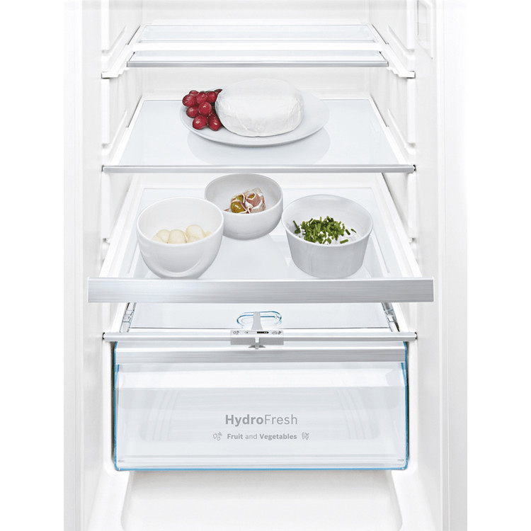 یخچال فریزر توکار بوش BOSCH مدل KIS87AF30 با رده انرژی ++A جزء سری 6 یخچال فریزر های توکار بوش میباشد . طراحی توکار این دستگاه مناسب برای افرادیست که یکدست بودن آشپزخانه برایشان اهمیت ویژه ای دارد. قسمت یخچال این دستگاه با ظرفیت 209 لیتر دارای 5 طبقه از جنس شیشه بوده که 4 طبقه ء آن قابلیت تنظیم ارتفاع دارند و متناسب با مواد غذایی میتوانید ارتفاع طبقات را تنظیم نمایید . کشویVita Fresh Plus میوه و سبزیجات را تا 2 برابر تازه تر نگهداری می نماید. 5 محفظه نیز برای نگهداری لبنیات ، بطری آب و … روی درب یخچال تعبیه شده است. فریزر بوش نیز با ظرفیت 61 لیتر از دو کشو تشکیل شده که شامل یک کشوی BIG BOX میباشد و حجم زیادی از مواد غذایی را در خود جای میدهد. سیستم انجماد سریع در فریزر موجب میشود مواد غذایی که تازه درون فریزر قرار دادید در مدت کمی به دمای داخل فریزر برسند و دیگر مواد غذایی درون فریزر، دمای خود را از دست ندهند. ظرفیت انجماد دستگاه 7 کیلوگرم در شبانه روز بوده و در صورت قطع ناگهانی برق تا 26 ساعت دمای داخلی فریزر را حفظ می نماید. توسط پنل بالای یخچال میتوانید تنظیمات دما دستگاه را انجام داد. در صورت باز ماندن درب یخچال و فریزر دستگاه به صورت خودکار توسط هشدار صوتی شما را مطلع میسازد.
