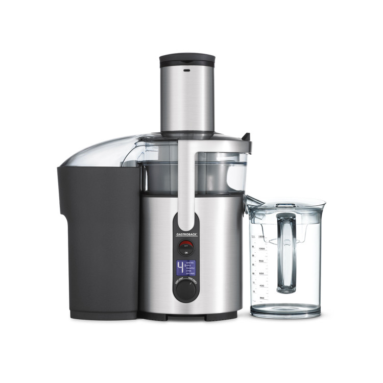 کمپانی گاستروبک آلمان یکی از مطرح ترین کمپانی های تولید لوازم برقی آشپزخانه است. از با کیفیت ترین محصولات گاستروبک می توان به آبمیوهگیریهای آن اشاره کرد که با وجود قدرت بالای موتور آنها واقعا بیصدا هستند. آبمیوهگیری گاستروبک مدل 40151 با توان مصرفی 1300 وات و بدنه استیل از جمله همین تولیدات با کیفیت و لوکس این کمپانی میباشد. این آبمیوهگیری با دهانه بزرگ ( 84 میلیمتری ) امکان آبگیری میوهها بدون برش زدن آنها را فراهم میکند. بر روی بدنه نمایشگر دیجیتال تعبیه شده است که میتوان میزان سرعت دستگاه را مشاهده کرد. جهت تهیه اسموتی تیغه مخصوص اسموتی ساز از جنس استیل ارایه شده است. بدنه تمام استیل این دستگاه علاوه بر زیباتر کردن ظاهر آبمیوهگیری موجب افزایش کیفیت و دوام دستگاه گردیده به طوری که این بدنه استیل در اثر استفاده و تماس با آبمیوههای غلیایی زنگ نزده و فرسوده نمیشود. واقعا کار کردن با این آبمیوهگیری لذت بخش است.