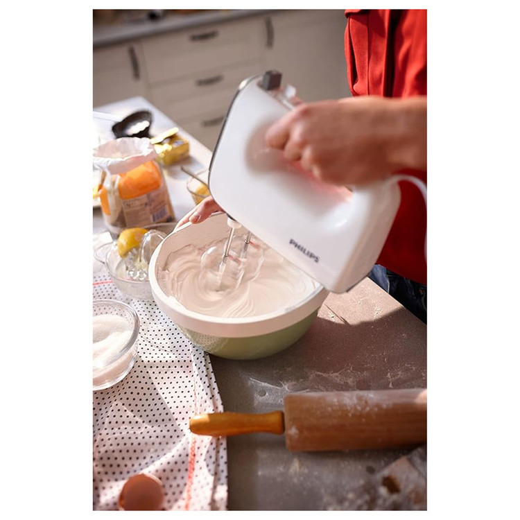 «HR3745/10» از همزنهای کارآمد شرکت «فیلیپس» است که امکانات بسیار کامل و مطلوبی دارد. این همزن با توان 450واتیاش میتواند در تهیه و ترکیب مواد اولیه آشپزی و شیرینیپزی کمک شایانی به مصرفکننده کند. سَریهای مختلف همزن بهصورت جفتی کار میکنند و هر چیزی را مخلوط کرده و هم میزنند. ظرفیت کاسهی همراه همزن فیلیپس مدل HR3745/10 سه لیتر است و میتواند برای تهیهی وعدهی غذا یا شیرینی و کیک متوسط تا بزرگ استفاده شود. برای همزدن مواد مختلف میتوان دستگاه را در پنج سرعت متفاوت تنظیم کرد؛ همچنین با قراردادن همزن در حالت توربو، سرعت آن افزایش یافته و در زمان کم مواد را با یکدیگر مخلوط میکند؛ ولی نکتهی متمایز این همزن اینجاست که میتواند با یک دکمه از پایهی ثابت جدا و بهصورت دستی استفاده شود. به این ترتیب محدودیت استفاده از ظرف همراه حذف شده و میتوان در ظروف مختلف عمل همزدن را انجام داد. سریهای همزن بهراحتی از دستگاه جدا شده و شسته میشوند. همچنین کاسهی این همزن با قابلیت چرخش اتوماتیک، عمل مخلوطکردن را برای کاربر سادهتر میکند. طول کابل همزن 1.2متر است و میتوانید تا میزان استاندارد آن را از پریز برق فاصله دهید.